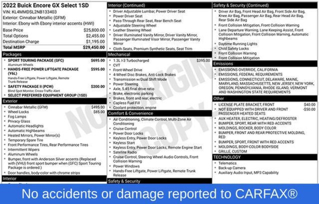 Odometer is 26546 miles below market average!Back Up Camera, Blind Spot Monitor, Cross Traffic Alert, Apple Car Play/Android Auto, Service Contract Available!, Heated Seats, 18 Aluminum Wheels, 2 USB Ports w/Auxiliary Input Jack, 4-Wheel Disc Brakes, 8-Way Power Driver Seat Adjuster, ABS brakes, Body Color Rocker Moldings, Body-Color Bodyside Moldings, Custom Grille w/Red Accents, Electronic Stability Control, Enhanced Performance 6-Speaker System, Front dual zone A/C, Hands Free Power Liftgate, Hands-Free Power Liftgate Package, Heated Driver & Front Passenger Seats, Lane Change Alert w/Side Blind Zone Alert, Power driver seat, Preferred Equipment Group 1SD, Radio: 8 Diagonal Buick Infotainment System, Rear Cross Traffic Alert, Red Front & Rear Bumper Protective Molding, Ride & Handling Suspension, Safety Package II, SiriusXM Radio, Sport Front Bumper w/Red Accents, Sport Rear Bumper w/Red Accents, Sport Touring Badge, Sport Touring Package, Wireless Apple CarPlay/Wireless Android Auto.Cinnabar Metallic 2022 Buick Encore GX Select 4D Sport Utility FWD CVT ECOTEC 1.3L Turbo 29/32 City/Highway MPG
