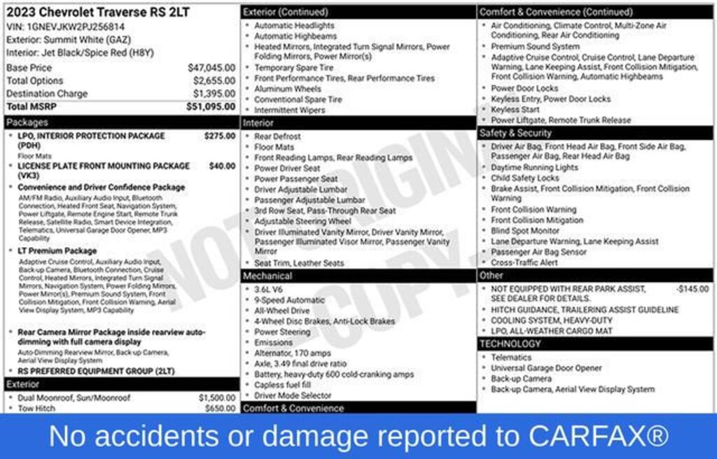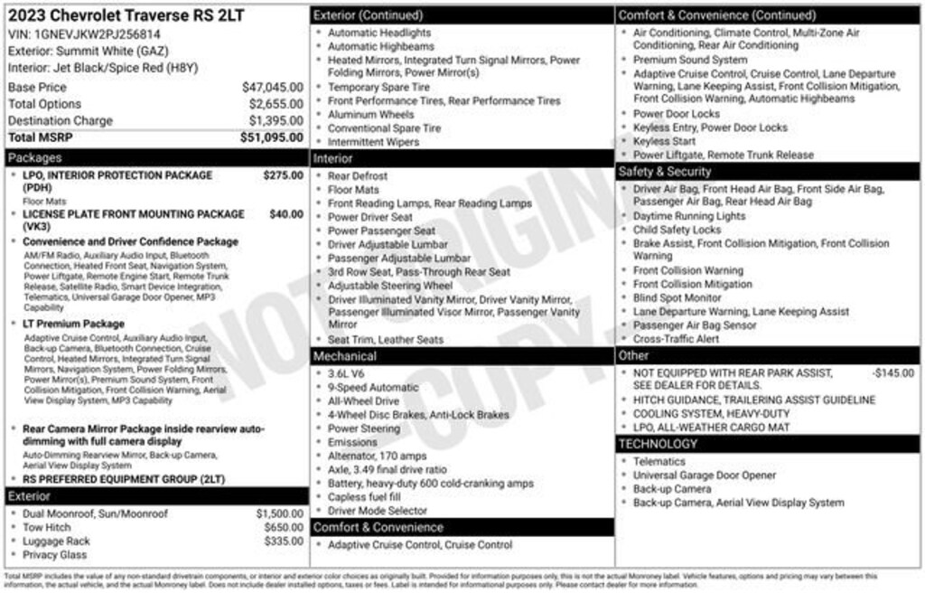 Discover the exceptional 2023 Chevrolet Traverse RS, a versatile and well-equipped SUV that seamlessly blends style, performance, and cutting-edge technology. This stunning vehicle is the perfect companion for your adventures, whether you're embarking on a family road trip, navigating the urban landscape, or tackling the great outdoors.Boasting a sleek and modern exterior in a striking White color, the Traverse RS commands attention wherever it goes. Under the hood, the powerful 3.6L V6 SIDI VVT engine, paired with a 9-Speed Automatic transmission and All-Wheel Drive, delivers an exhilarating driving experience with an impressive fuel efficiency of 17 city MPG and 25 highway MPG.- Apple CarPlay/Android Auto- Back Up Camera- Blind Spot Monitor- Bluetooth- Cross Traffic Alert- Heated Seats- Leather Seats- Satellite Radio- Sunroof Moonroof- Dual SkyScape 2-Panel Power Sunroof- Trailering Equipment- Interior Protection Package (LPO)The Traverse RS is equipped with a wealth of premium features that elevate your driving experience. Indulge in the convenience of the Bose Premium 10-Speaker Audio System, the intuitive Chevrolet Infotainment 3 Plus System with Navigation, and the added safety of the Rear Parking Camera and Hitch Guidance with Hitch View. Stay connected and entertained with seamless integration of your smartphone via Apple CarPlay and Android Auto.Comfort and versatility are at the forefront of the Traverse RS design. Sink into the plush, perforated Leather-Appointed Seats, which are both heated and power-adjustable, ensuring a personalized driving position. The Dual-Zone Automatic Climate Control and Heated Steering Wheel provide year-round comfort, while the Split-Bench Third-Row Seating offers ample room for passengers and cargo.Safety is paramount in the Traverse RS, with features like Forward Collision Alert, Lane Keep Assist with Lane Departure Warning, and Automatic Emergency Braking keeping you and your loved ones secure on the road. The Blind Spot Monitor and Rear Cross-Traffic Alert further enhance your awareness, while the Trailering Equipment package provides the confidence to tow your toys with ease.Experience the exceptional 2023 Chevrolet Traverse RS and discover the perfect blend of style, performance, and technology. Visit our showroom today to take this remarkable SUV for a test drive and see how it can elevate your driving experience.