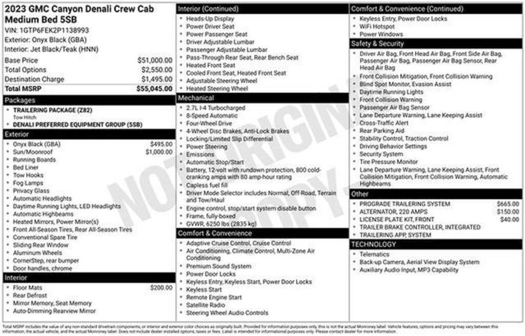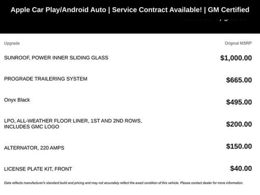 Odometer is 2262 miles below market average!Bluetooth, Sunroof Moonroof, Leather Seats, Back Up Camera, Blind Spot Monitor, Cross Traffic Alert, Apple Car Play/Android Auto, Service Contract Available!, GM Certified, Heated Seats, Cooled Seats, 4WD, 120-Volt Bed Mounted Power Outlet, 2 1st Row USB Charge/Data Ports, 2 Rear USB Ports in Center Console (Charge-Only), 5 Rectangular Chrome Assist Steps, 6-Way Power Passenger Seat Adjuster, 8-Way Power Driver Seat Adjuster, ABS brakes, Adaptive Cruise Control, Apple CarPlay/Android Auto, Auto High-beam Headlights, Automatic Locking Rear Differential, Blind Zone Steering Assist, Brake assist, Canyon Pro Safety, Driver & Front Passenger Illuminated Visors, Driver & Front Passenger Ventilated Seats, Driver Memory, Driver Seatback Map Pocket, Dual-Zone Automatic Air Conditioning, Electronic Stability Control, EZ-Lift & Lower Tailgate, Front fog lights, Front LED Fog Lamps, HD Surround Vision, Heads-Up Display, Heated Driver & Front Passenger Seats, Heated front seats, Heated Power-Adjustable Outside Mirrors, Heated Steering Wheel, Heated steering wheel, Inside Rear-View Auto-Dimming Mirror, Interior Overhead Courtesy Light w/Dual Reading Lamp, Manual Rear-Sliding Window, Memory seat, Multicolor 6.3 Diagonal Head-Up Display, MultiStow Tailgate, Navigation System, Power Driver Lumbar Control Seat Adjuster, Power driver seat, Power Inner Sliding Glass Sunroof w/Manual Shade, Power Passenger Lumbar Control Seat Adjuster, Preferred Equipment Group 5SB, Premium 7-Speaker Bose Sound System, ProGrade Trailering System, Radio: 11.3 Diagonal Premium GMC Infotainment Sys, Rear Center Fold-Down Armrest w/2 Cupholders, Rear Cross Traffic Braking, Rear of Console 120-Volt Power Outlet, Rear Pedestrian Alert, Rear-Window Electric Defogger, Remote Vehicle Starter System, Safety Alert Seat, Security system, SiriusXM w/360L, Spray-On Bedliner, Tailgate Keyed Cylinder Lock, Tilt & Telescopic Manual Steering Column, Trailering App System, Trailering Package, Ultrasonic Rear Park Assist, Ventilated front seats, Wheels: 20 x 9 Diamond Cut Dark Gray Aluminum, Wireless Apple CarPlay/Wireless Android Auto, Wireless Charging.Certified. Onyx Black 2023 GMC Canyon Denali 4D Crew Cab 4WD 8-Speed Automatic 2.7L TurboGMC Certified Pre-Owned Details:* Transferable Warranty* Limited Warranty: 12 Month/12,000 Mile (whichever comes first) from certified purchase date* Roadside Assistance* 172 Point Inspection* Powertrain Limited Warranty: 72 Month/100,000 Mile (whichever comes first) from original in-service date* Vehicle History* 24 months/24,000 miles (whichever comes first) Certified Pre-Owned Scheduled Maintenance Plan and 3 days/150 miles (whichever comes first) Vehicle Exchange Program. SiriusXM 3-month trial subscription* Warranty Deductible: $0